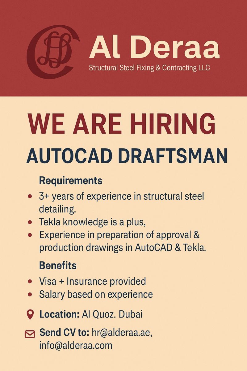 Al Deraa Structural Steelis hiring a skilled AutoCAD Draftsman with strong expertise in structural steel detailing. The ideal candidate will be responsible for producing accurate and detailed drawings for steel structures, collaborating closely with engineers and project teams to ensure designs meet project specifications.