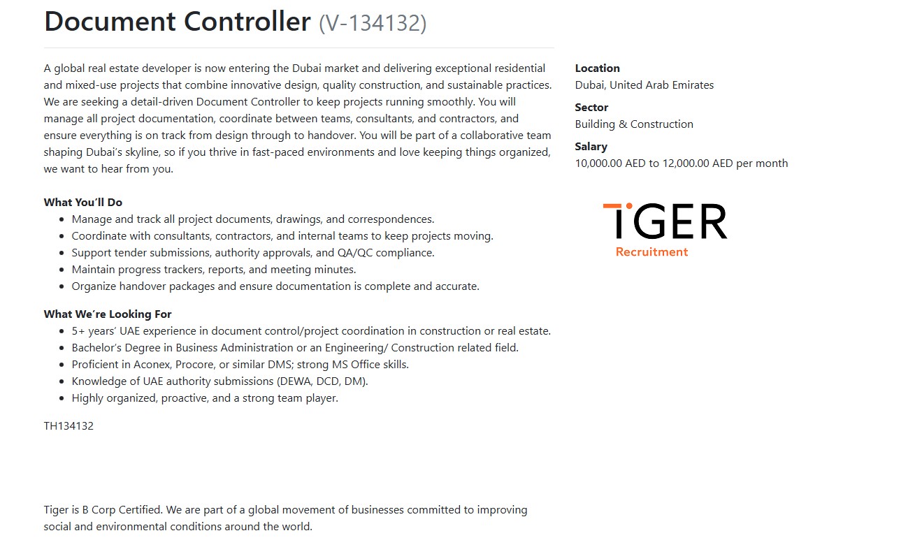 - Minimum 5 years of UAE experience in document control or project coordination within construction or real estate sectors.
