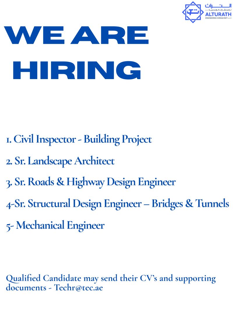 We are inviting qualified and experienced professionals to join our expanding engineering consultancy team in the UAE. Our firm is dedicated to delivering high-quality engineering, supervision, and design solutions across building, infrastructure, structural, and mechanical disciplines.