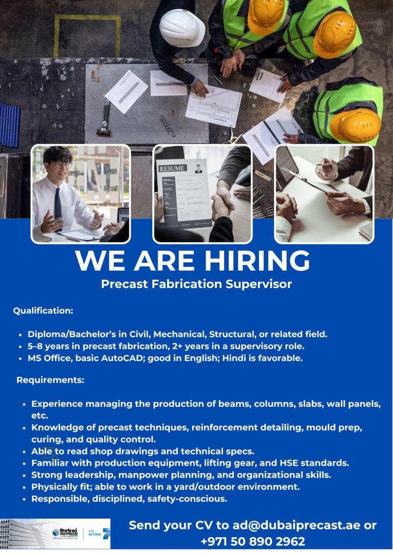Dubai Precast LLC is hiring a Precast Fabrication Supervisor to oversee the production of precast elements such as beams, columns, slabs, and wall panels. The ideal candidate should hold a Diploma or Bachelor’s degree in Civil, Mechanical, or Structural Engineering.