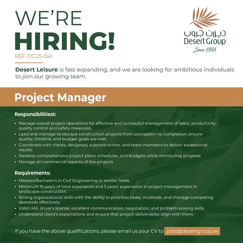 Desert Group is looking for an experienced Project Manager – Landscape Construction to join our growing team. The ideal candidate will manage complex landscape construction projects, ensuring quality execution, timely delivery, and effective coordination across teams and stakeholders.