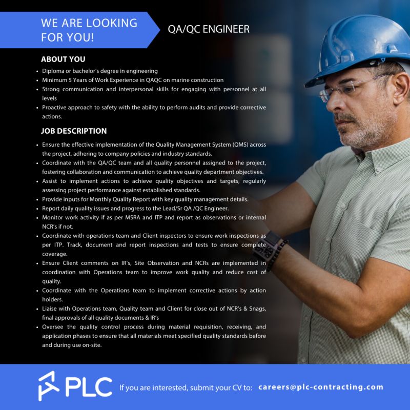 PLC Contracting LLC is hiring a qualified and detail-oriented QA/QC Engineer to support the successful execution of marine construction projects. The role focuses on ensuring compliance with approved quality standards, project specifications, and regulatory requirements. The successful candidate will collaborate with project teams to improve quality performance, reduce risks, and promote a strong culture of continuous improvement across all operations.