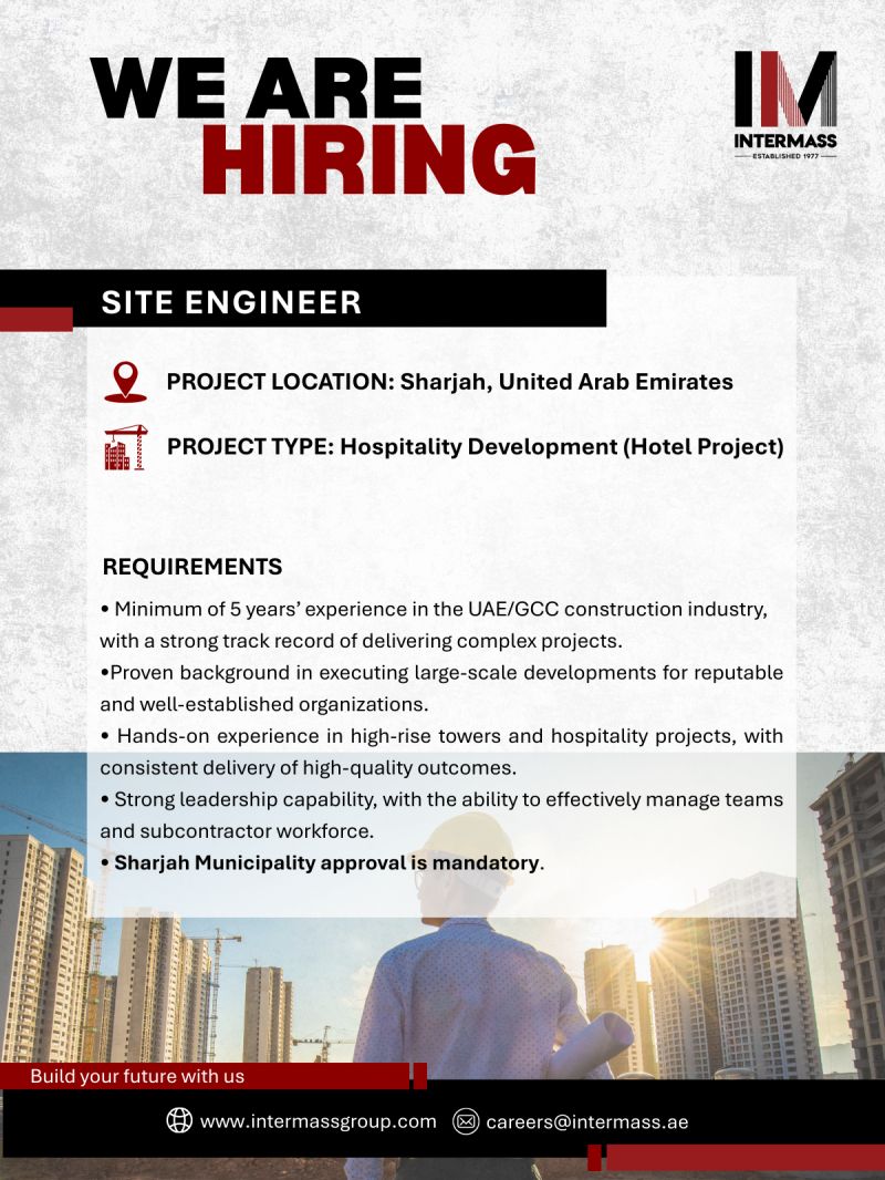 Intermass is strengthening its workforce as we continue expanding our portfolio of landmark projects across the UAE. We are seeking experienced Site Engineers who possess strong technical capabilities, excellent coordination skills, and a commitment to delivering high-quality work.