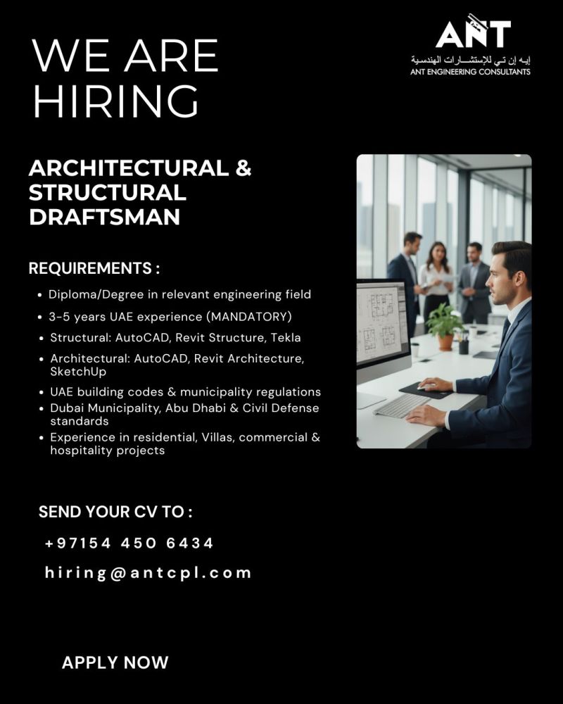 A N T Engineering Consultants (ANTCPL) is hiring skilled and detail-oriented Structural Draftsman to support ongoing and upcoming projects across the UAE and India. The ideal candidate must possess strong drafting expertise, excellent technical accuracy, and the ability to work in a fast-paced, multidisciplinary environment.